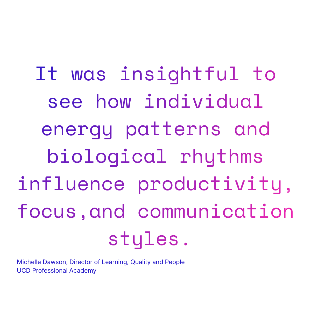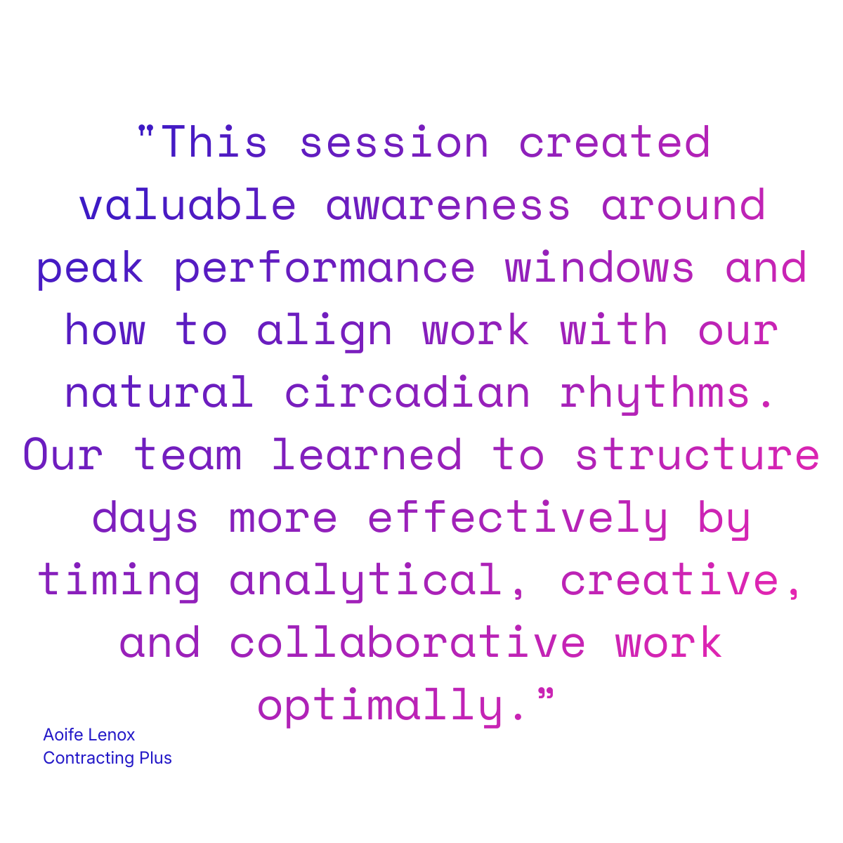 We combine organisational psychology, systems thinking, and Lean principles, all anchored in chronobiology, the science natural human energy and timing.